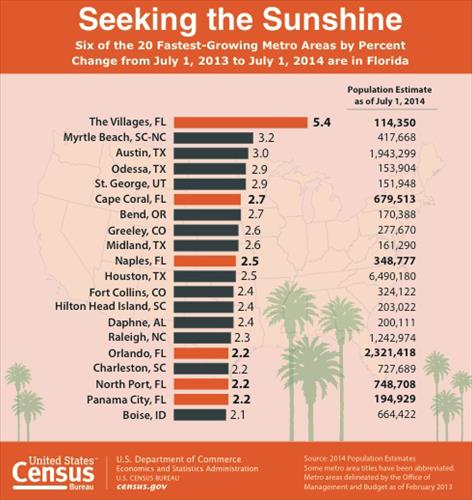 인구증가율이 가장 높은 20대 도시 가운데 1위는 플로리다 주 빌리지스다. 이 도시는 이 기간에 인구는 5.4% 늘어 11만4천350명을 기록했다.