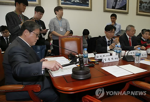| △ 공무원연금 개혁 국민대타협기구 연금개혁 분과위 (서울=연합뉴스) 이상학 기자 = 26일 오후 국회에서 열린 공무원연금 개혁을 위한 국민대타협기구 연금개혁 분과위에서 조원진 공동위원장이 의사봉을 두드리고 있다. |
