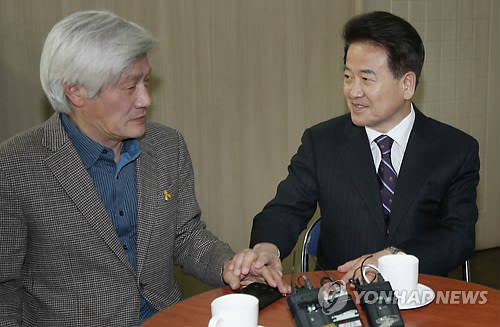 | △ 대화하는 정동영 김세균 (서울=연합뉴스) 이상학 기자 = 국민모임 정동영 전 의원과 김세균 상임위원장이 26일 오후 여의도 '대륙으로 가는 길' 사무실에서 4·29 재보궐선거 등과 관련해 대화를 하고 있다. 2015.3.26 leesh@yna.co.kr |