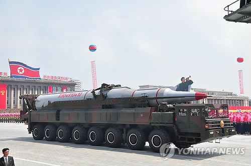 | △ 2013년 7월 27일 평양 김일성 광장에서 열린 정전 60주년 열병식에 등장한 북한 대륙간탄도미사일(ICBM) KN-08. (연합뉴스 자료사진) |