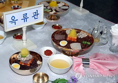 | △ 2014년 11월 평양시내 냉면 전문점 10여 곳이 참가한 국수(냉면)경연대회가 옥류관에서 열렸다. 대회에서는 옥류관이 1위를, 청류관이 2위를 차지했다. (평양 조선중앙통신=연합뉴스) |