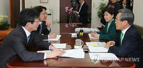 | △ 새누리당 유승민·새정치민주연합 우윤근 원내대표가 17일 국회 새정치민주연합 원내대표실에서 정치개혁특위 문제를 협상하고 있다. 왼쪽부터 새누리당 유승민 원내대표, 이종훈 원내대변인, 새정치민주연합 서영교 원내대변인, 우윤근 원내대표. |