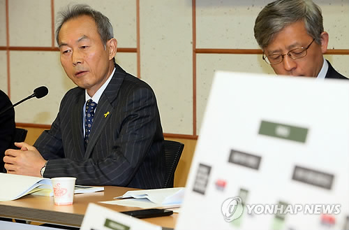 | △ 굳은 표정의 이석태 위원장 (서울=연합뉴스) 진성철 기자 = 4·16 세월호 참사 특별조사위원회의 이석태 위원장(왼쪽)이 29일 국회 의원회관에서 열린 긴급기자회견에서 굳은 표정을 짓고 있다. |