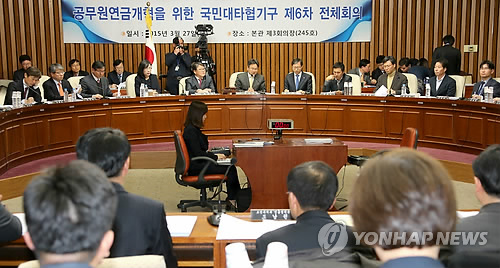| △ 공무원연금개혁을 위한 국민대타협기구 마지막 전체회의 (서울=연합뉴스) 백승렬 기자 = 27일 국회에서 열린 공무원연금개혁을 위한 국민대타협기구 마지막 전체회의에서 참석자들이 토론을 벌이고 있다. |