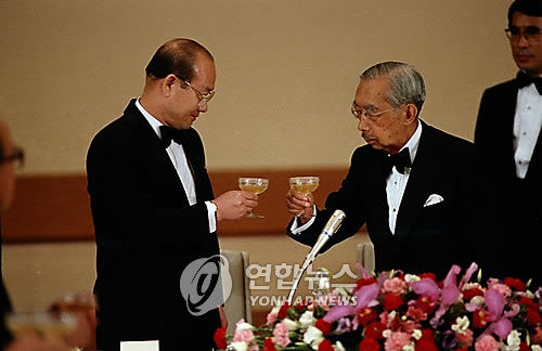 | △ 1984년 당시 전두환 대통령이 일본에 방문해 일왕주최 공식 만찬장에서 히로히토 일왕과 건배하고 있다. (연합뉴스 자료사진) |
