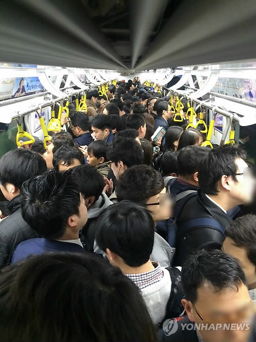 | △ '콩나물시루' 9호선 (서울=연합뉴스) 한종찬 기자 = 지하철 9호선 2단계 구간 개통 후 첫 출근일인 30일 오전 염창역을 출발한 9호선 내부가 출근길에 오른 승객들로 발 디딜 틈 없이 북적거리고 있다. |