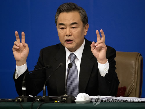 | △ 中외교부장, 북중 정상회담 가능성 시사 (AP=연합뉴스) 왕이 중국 외교부장은 8일(현지시간) 베이징 미디어센터에서 가진 내외신 기자회견에서 "중북 관계는 기초가 매우 튼튼하기 때문에 특정 시기와 개별적인 일에 영향을 받아서도 안 되며 받을 수도 없다"면서 북한과 중국의 정상회담 문제와 관련해 "양측의 편리한 시기가 언제인지 봐야 한다"고 말했다. 이는 김정은 북한 국방위원회 제1위원장의 러시아 방문과 관계없이 시진핑 중국 국가주석과 김 제1위원장의 만남이 적절한 시기에 추진될 수 있음을 시사한 것으로 풀이된다. 사진은 이날 왕이 외교부장이 내외신 기자회견을 하고 있는 모습. marshal@yna.co.kr China's Foreign Minister Wang Yi gestures while speaking at a press conference in Beijing, Sunday, March 8, 2015. Wang renewed calls for Japanese leaders to abandon any attempt to water down the nation’s guilt over its World War II aggression against China and others. Wang said that history continues to haunt relations between Beijing and Tokyo. He said Japanese leaders should drop their historical baggage and make a clean break with Japan’s militaristic past. (AP Photo/Mark Schiefelbein) |