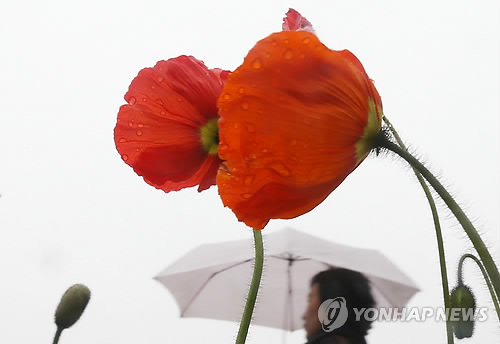 | △ 촉촉한 봄비 (서울=연합뉴스) 이지은 기자 = 전국적으로 봄비가 내린 18일 오후 서울 광화문광장에 설치된 화단 옆으로 한 시민이 우산을 쓴 채 걷고 있다. 2015.3.18 jieunlee@yna.co.kr |