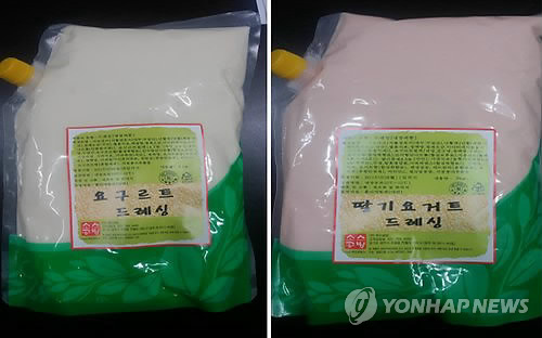 | △ 유통기한 지난 원료 사용한 드레싱 제품 회수 조치 (서울=연합뉴스) 식품의약품안전처는 식품제조·가공업체 '푸드공방'이 유통기한이 지난 원료를 사용해 제조한 '요구르트 드레싱'과 '딸기 요거트 드레싱' 등 2개 드레싱 제품에 대해 판매 중단과 회수 조치를 내렸다고 31일 밝혔다. 회수 대상 제품의 유통 기한은 '요구르트 드레싱'이 2015년 7월 12일, 7월 20일, 8월 3일, 9월 3일, 9월 8일, 9월 21일이며, '딸기 요거트 드레싱'은 2015년 7월 12일, 8월 11일, 9월 15일이다. (식약처 제공) |