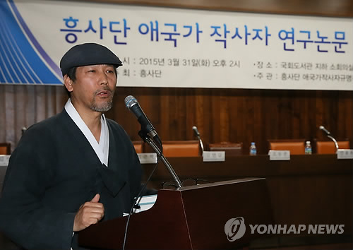 | △ 애국가 작사자는 누구? (서울=연합뉴스) 진성철 기자 = 31일 국회도서관에서 열린 '흥사단 애국가 작사자 연구논문 발표회'에서 김연갑 한겨레아리랑연합회 이사가 윤치호 작사설을 주장하고 있다. |