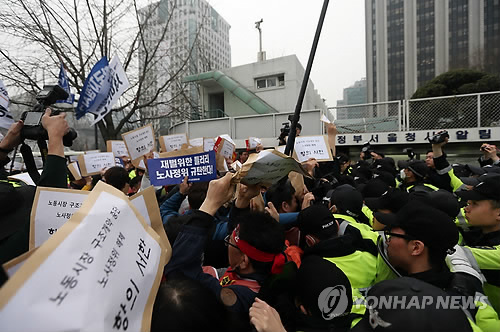 | △ 경찰에 막힌 집회 참가자들 (서울=연합뉴스) 신준희 기자 = 31일 오후 세종로 정부서울청사 앞에서 열린 민주노총의 노동시장 구조개악 저지 노사정위 규탄 결의대회를 마친 참가자들이 항의서한을 전달하기 위해 노사정위가 열리는 청사로 진입하려다 경찰에 막히고 있다. 2015.3.31 hama@yna.co.kr |