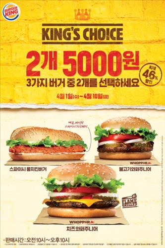 이번 '킹스 초이스' 프로모션 대상 메뉴는 치즈와퍼주니어·불고기와퍼주니어·스파이시롱치킨버거로, 소비자는 이들 중 2개를 5천원에 구매할 수 있다. 할인 행사는 전국 버거킹 매장에서 오전 10시부터 오후 10시까지 진행된다.