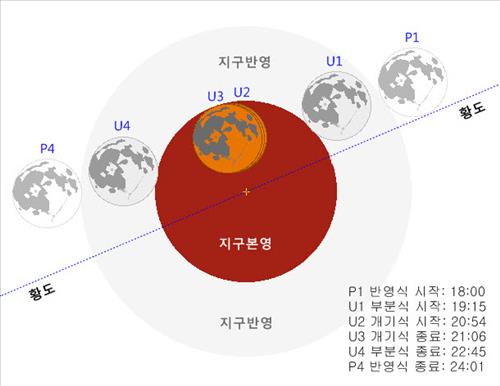 이날 달이 뜨는 시간은 오후 6시 48분. 오후 7시 15분부터 달이 지구의 본그림자에 가려지기 시작해 8시 5분부터 9시 6분까지는 달 전체가 사라진다. 이어 서서히 달이 모습을 드러내다 10시 45분 지구그림자에서 완전히 벗어난다.