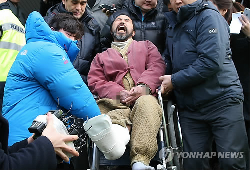 | △ 살인미수 혐의로 기소된 김기종씨 (서울=연합뉴스) 마크 리퍼트 주한 미국대사를 흉기로 공격한 김기종씨가 1일 살인미수 혐의 등으로 구속기소됐다. 사진은 지난 달 9일 김씨가 종로경찰서에서 휠체어에 탄 채 진료를 받기 위해 차량으로 향하는 모습. <<연합뉴스 DB>> seephoto@yna.co.kr |