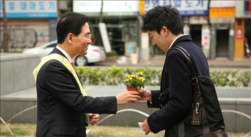 <사진 : 한솔제지 이상훈 대표가 2일 출근길 시민에게 화분을 나눠주고 있다.>