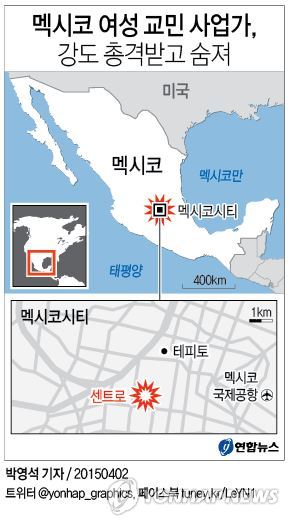 (멕시코시티=연합뉴스) 이동경 특파원 = 1일 오후 6시께(현지시간) 멕시코 수도 멕시코시티의 재래상가인 센트로에서 한국 교민인 여성 의류 사업가 이 모(52)씨가 강도의 권총에 맞아 숨졌다.