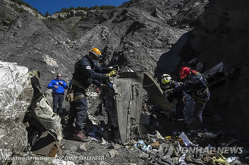 | △ (EPA=연합뉴스) 지난 1일(현지시간) 저먼윙스 여객기가 추락한 알프스 사고 현장에서 수색 구조 대원들이 잔해를 모으고 있다. |