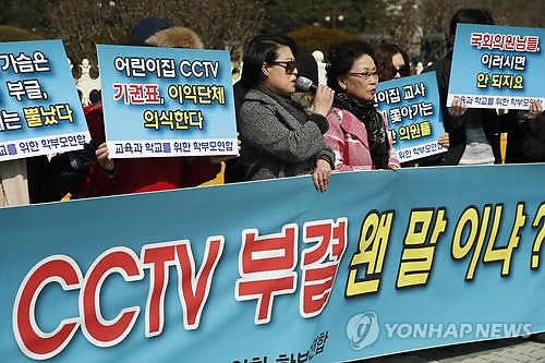 | △ 어린이집 CCTV부결 항의 기자회견 (서울=연합뉴스) 이상학 기자 = 교육과 학교를 위한 학부모연합 회원들이 6일 국회 앞에서 어린이집 CCTV부결 항의 기자회견을 하고 있다. 2015.3.6 leesh@yna.co.kr |