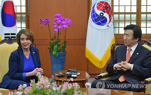| △ 낸시 펠로시, 윤병세 장관 면담 (서울=연합뉴스) 박지호 기자 = 방한중인 낸시 펠로시 미국 민주당 하원 원내대표(왼쪽)가 2일 오후 서울 도렴동 외교부를 찾아 윤병세 외교부 장관과 면담하고 있다. |