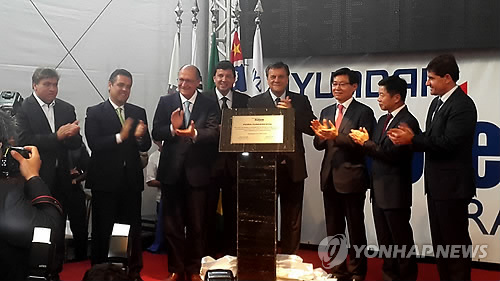 | △ 현대로템, 브라질 철도차량 생산공장 기공식 (상파울루=연합뉴스) 김재순 특파원 = 현대로템은 2일(현지시간) 상파울루 주 아라라콰라 시에서 연간 150량 생산능력을 갖춘 공장 기공식을 했다. 기공식에는 김승탁 현대로템 대표이사와 홍영종 상파울루 총영사, 제라우두 아우키민 상파울루 주지사, 마르셀루 바르비에리 아라라콰라 시장 등 정·관계와 재계 인사 500여 명이 참석했다. 내년 3월 완공 목표인 브라질 공장은 미국·터키에 이은 현대로템의 세 번째 국외 생산거점이다. 2015.4.3 fidelis21c@yna.co.kr |