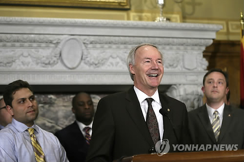 | △ (AP=연합뉴스) 아사 허친슨 미국 아칸소 주지사(가운데)가 2일(현지시간) 아칸소주 리틀록의 주 정부 청사에서 개정된 종교자유보호법이 주 의회를 통과한 뒤 법안에 서명하기 전 기자들과 대화하고 있다. Arkansas Gov. Asa Hutchinson speaks to reporters before signing a reworked religious freedom bill into law after it passed in the House at the Arkansas state Capitol in Little Rock, Ark., Thursday, April 2, 2015. Arkansas Senate President Sen. Jonathan Dismang, R-Beebe, left, and House Speaker Rep. Jeremy Gillam, R-Judsonia, right, listen. (AP Photo/Danny Johnston) |
