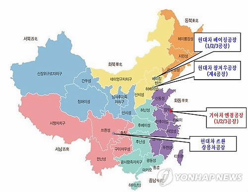 | △ 현대차, 중국 창저우시에 제4공장 착공 (창저우=연합뉴스) 이준삼 특파원 = 현대차가 3일 중국 허베이성 창저우시에서 중국 제4공장 착공식을 열었다. 사진은 현대차그룹의 중국 공장 운영 현황. 2015.4.3 << 현대차 제공 >> jslee@yna.co.kr |