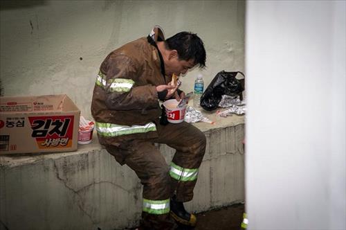 그을음이 잔뜩 묻은 방화복을 입은 한 소방관이 벽 끝에 걸터앉아 컵라면을 허겁지겁 먹는 모습이다.