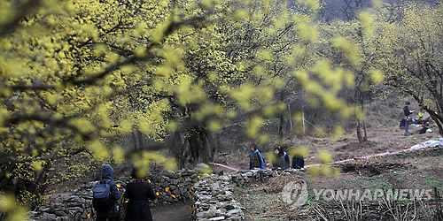 | △ 산수유꽃 만개한 돌담길을 걷다 (이천=연합뉴스) 신영근 기자 = 3일 오전 경기도 이천시 백사면 제16회 이천백사 산수유꽃 축제가 개막돼 시민들이 산수유꽃이 만개한 돌담길을 걸으며 다가온 봄을 즐기고 있다. 산수유꽃 축제는 오는 5일까지 백사면 도립리, 경사리, 송말리 등 산수유마을에서 개최된다. 2015.4.3 drops@yna.co.kr |