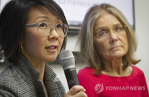 | △ '위민크로스디엠지'(WomenCrossDMZ)의 크리스틴 안(왼쪽)과 글로리아 스타이넘(오른쪽)이 지난달 11일 유엔본부에서 기자회견을 하고 있다. (AP=연합뉴스 자료사진) |