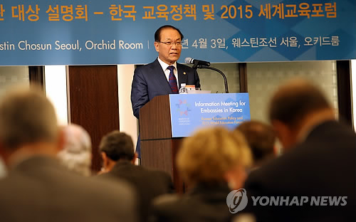 황 부총리는 이날 오후 교육부가 서울 중구 웨스틴조선호텔에서 주한 외국공관을 대상으로 개최한 교육정책 및 2015 세계교육포럼 설명회에서 내달 인천 송도에서 열리는 세계교육포럼의 성공적 개최를 위한 관심과 협력을 당부하면서 이같이 말했다.