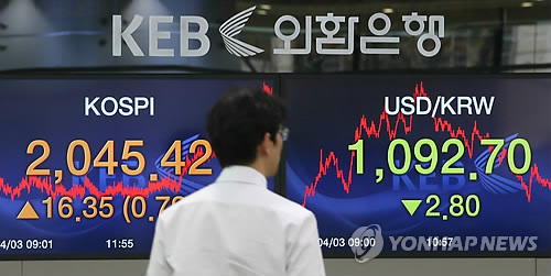 | △ 2,040선 안착한 코스피…연중 최고 (서울=연합뉴스) 임헌정 기자 = 코스피가 3일 연중 최고점을 돌파하며 2,040선에 안착했다. 코스닥도 연고점을 뛰어넘어 7년 2개월여 만에 최고를 기록했다. 코스피는 전날보다 16.35포인트(0.81%) 오른 2,045.42로 마감했다. 이날 오후 서울 중구 을지로 외환은행 본점 딜링룸. |