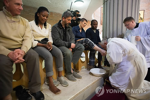 프란치스코 교황은 로마 레비브비아 교도소를 방문해 6명의 남자 재소자와 인근 여자 수용시설에 있는 여성 6명, 그리고 6명의 여성 중 아프리카 출신 여성이 데리고 온 어린이의 발에 물을 붓고 씻어주는 의식을 거행했으며 일부 재소자들은 이 과정에서 눈물을 흘리기도 했다고 바티칸 라디오가 전했다.