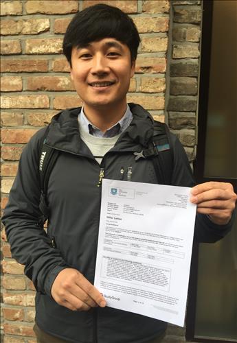 | △ (서울=연합뉴스) 이대희 기자 = 탈북 11년만에 영국 유학길에 오르는 김성렬(30)씨가 셰필드대학 입학허가서를 들고 활짝 웃고 있다. 2015.4.6 2vs2@yna.co.kr |