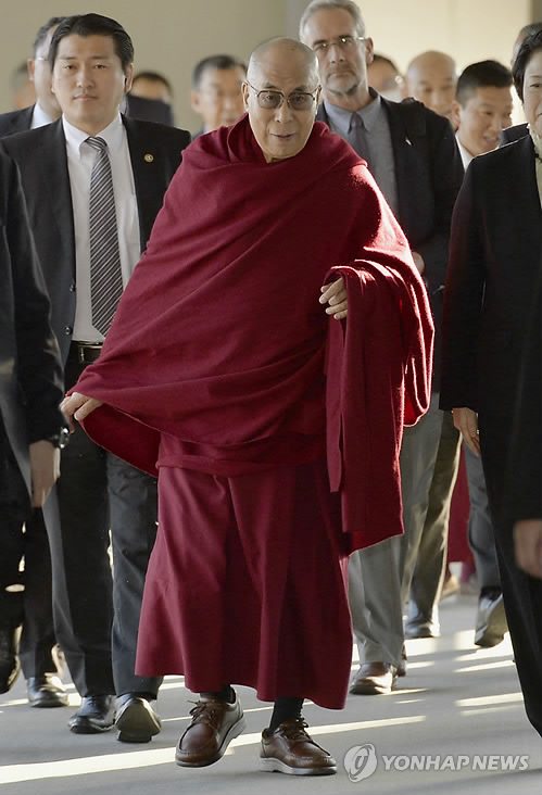 | △ 달라이 라마, 일본 방문 (AP/교도통신=연합뉴스) 티베트의 정신적인 지도자 달라이 라마(가운데)가 2일(현지시간) 13일 간의 일정으로 일본을 방문하기 위해 도쿄 인근 나리타 공항에 도착하고 있다. Tibetans' spiritual leader the Dalai Lama, center, arrives at Narita International Airport in Narita, near Tokyo Thursday, April 2, 2015. The Dalai Lama is on a 13-day visit to Japan. (AP Photo/Kyodo News) JAAPN OUT, MANDATORY CREDIT |