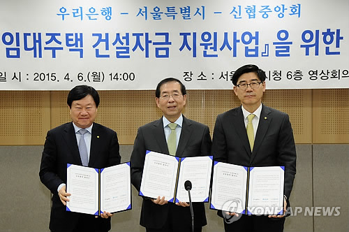 | △ 서울시 준공공임대주택 건설자금 지원사업 (서울=연합뉴스) 박원순 서울시장(가운데)이 6일 오후 서울시청 신청사 6층 영상회의실에서 열린 '준공공임대주택 건설자금 지원사업'을 위한 협약식'에서 이광구 우리은행장(왼쪽), 문철상 신협중앙회장(오른쪽)과 협약서를 들고 기념촬영을 하고 있다. 협약을 통해 우리은행과 신협중앙회는 이달 중 관련 금융상품을 출시하고 서울시가 행정적·제도적으로 지원키로 했다. (서울시 제공) |