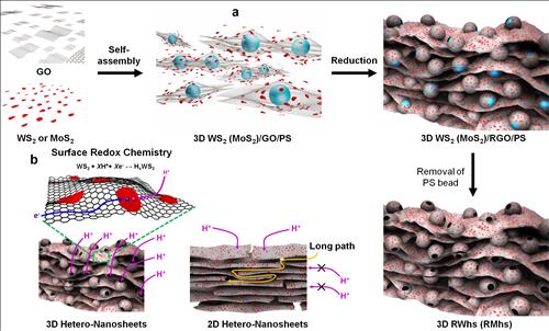 흑연을 단일 층으로 벗겨 내 그래핀을 얻듯이 화학적 박리법으로 전이금속과 황으로 이루어진 수나노미터(㎚=10억분의 1m) 두께의 층상 무기화합물(MoS₂,WS₂) 나노시트를 만들고서 이를 한 장씩 다시 쌓아 2차원 나노시트 골격의 3차원 구조체를 합성했다. 이 3차원 나노구조체는 전기화학적으로 반응하는 2차원 나노시트가 서로 겹치지 않게 단일 장으로 표면을 노출, 이온 확산과 전하 이동이 촉진돼 효율이 높다.