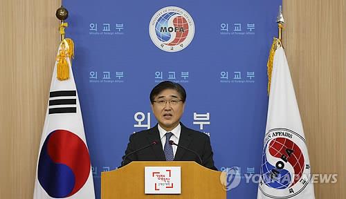 | △ 정부 입장 발표하는 외교부 대변인 (서울=연합뉴스) 이지은 기자 = 노광일 외교부 대변인이 6일 오후 서울 종로구 도렴동 외교부 브리핑룸에서 일본의 독도에 대한 부당한 영유권 주장을 강화한 중학교 교과서 검정 통과에 관한 성명을 발표하고 있다. |