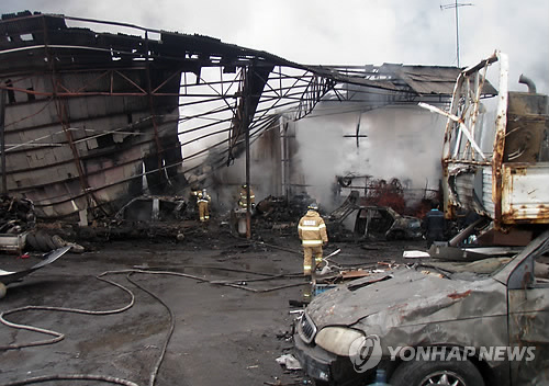 | △ 무주 폐차장서 불 (무주=연합뉴스) 6일 오후 4시 33분께 전북 무주군 설천면의 한 폐차장에서 불이 나 1시간 50분 만에 진화됐다. 이 불로 폐차장 작업장과 사무실 150㎡가 타 2천600여만원(소방서 추산)의 재산피해가 났으며 인명피해는 발생하지 않았다. 2015.4.6 << 전북소방본부 >> sollenso@yna.co.kr |