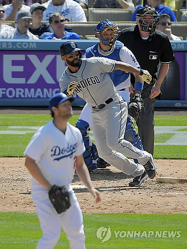 | △ (AP=연합뉴스) 지난해까지 LA 다저스에서 뛰다 샌디에이고 파드리스로 이적한 맷 켐프가 7일(한국시간) 다저스타디움에서 열린 다저스와 경기에서 상대 에이스 클레이턴 커쇼를 공략해 2루타를 쳐내고 있다. |