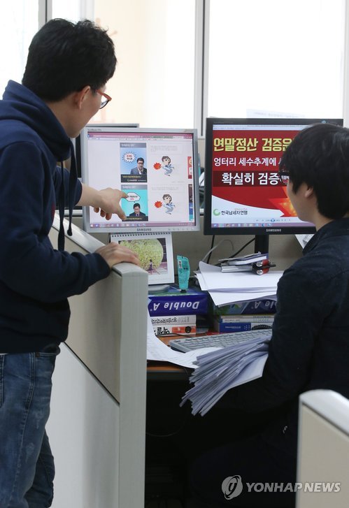 | △ 납세자연맹 "연말정산 보완책 합리성, 공평성 결여' (서울=연합뉴스) 김주성 기자 = 정부가 연말정산 보완대책을 발표한 7일 서울 종로구 신문로 한국납세자연맹에서 직원들이 이번 보완책과 관련한 납세자 권리 찾기 활동 계획을 논의하고 있다. |
