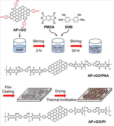 | △ 그리핀-폴리이미드 복합소재 제조과정. 산화 그래핀을 화학적으로 환원시키는 동시에 그래핀 표면에 고분자 수지와의 화학결합을 유도할 수 있는 물질(아민기, -NH₂)을 도입한 다음 폴리이미드 원료물질과 용액상태에서 중합반응시켜 고분자 내에 그래핀이 균일하게 분산된 폴리이미드 복합소재를 제조한다. |