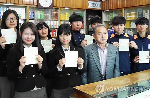 | △ "선배님, 감사합니다" (옥천=연합뉴스) 박병기 기자 = 충북 옥천의 청산고등학교 학생들이 7일 선배인 약사 박명식(73·앞 줄 가운데)씨로부터 현금 5만원이 든 통장과 체육복을 선물 받은 뒤 기념촬영하고 있다. 2015.4.7 <<청산고등학교 제공>> bgipark@yna.co.kr |