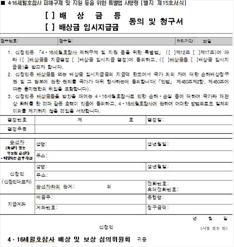 동의서에는 '신청인은 배상금 등을 받았을 때에는 세월호 참사로 인한 손해ㆍ손실 등에 대해 국가와 재판상 화해를 한 것과 같은 효력이 있음에 동의하고, 참사에 관해 어떠한 방법으로도 일체 이의를 제기하지 않을 것임을 서약합니다'라고 적혀 있다.