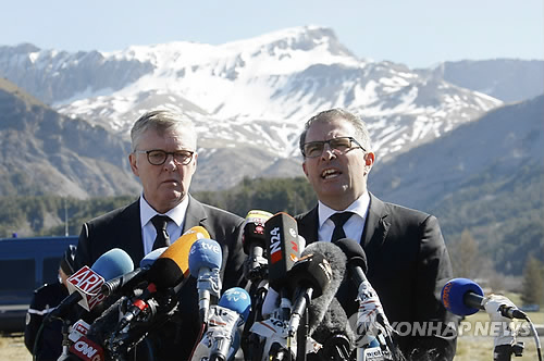 | △ CEO of Germanwings Thomas Winkelmann, left, and Lufthansa CEO Carsten Spohr attend a press conference near the site of the Germanwings jet crash, in Le Vernet, France, Wednesday, April 1, 2015. The heads of Lufthansa and its low-cost airline Germanwings are visiting the site of the crash that killed 150 people amid mounting questions about the co-pilot and how much his employers knew about his mental health. (AP Photo/Claude Paris) |
