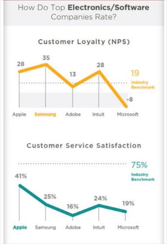 한편 '소비자 만족도' 조사에서는 애플이 만족도 41%로 1위, 삼성전자는 25%로 2위에 올랐지만 두 회사 모두 서베이몽키가 제시한 기준점(75%)에는 한참 모자랐다.
