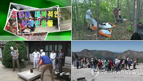 | △ 북한, 외국인관광객 유치전…"캠핑부터 농장체험까지" (서울=연합뉴스) 조선중앙통신은 26일 이례적으로 '조선의 매력적인 주제관광들'이라는 제목의 홍보영상을 제작해 홈페이지에 올렸다. 4분 길이 영상은 관광지와 관광객의 모습을 담은 영상과 관광상품을 소개하는 남성의 내레이션, 경쾌한 배경 음악으로 구성됐다. 사진은 외국인들이 캠핑과 체육, 농장체험 등 북한 관광을 즐기는 영상의 한 장면. 2015.2.26 nkphoto@yna.co.kr |