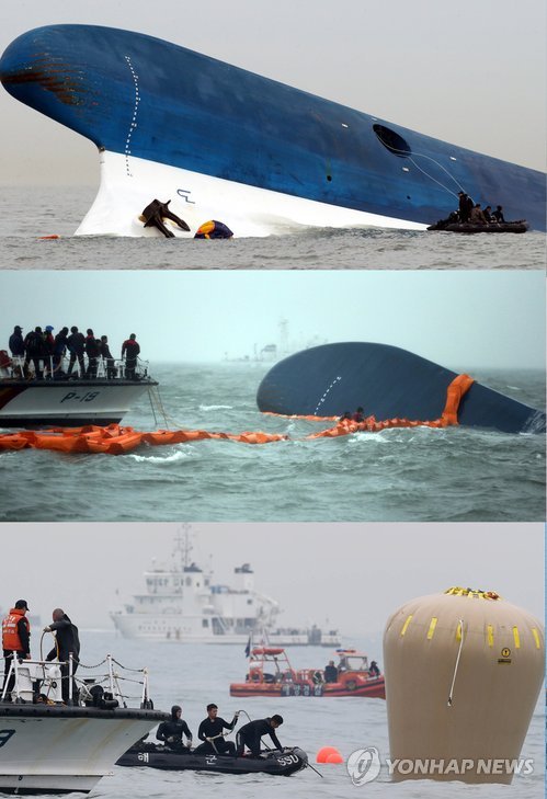 | △ <세월호 참사 1년> 야속하게 침몰하는 세월호 (진도=연합뉴스) 세월호 참사가 발생한 지 16일로 1년이 된다. 상당수 국민은 충격과 슬픔에서 벗어나 일상으로 돌아갔지만 유족과 실종자 가족의 상처는 여전하다. 2014년 4월 16일 전남 관매도 앞 해상에서 일어난 전복 사고 직후 선수 부분이 나온 세월호의 모습과 4월 17일 오전 모습(가운데). 4월 18일 오후 물 아래로 잠긴 가운데 리프트백을 설치한 모습. (연합뉴스 자료사진) |