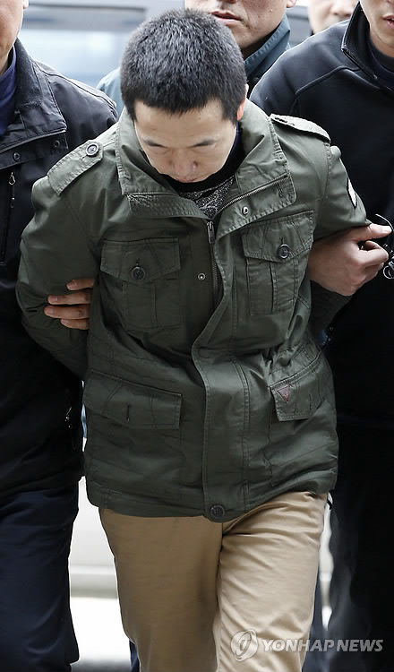 | △ 시흥 토막살인 용의자 김하일씨 긴급체포 (시흥=연합뉴스) 류수현 기자 = 경기도 시흥 시화방조제에서 발견된 토막시신 사건의 유력한 용의자인 중국 국적의 김하일씨가 긴급체포돼 8일 오전 경기도 시흥경찰서로 들어가고 있다. 2015.4.8 drops@yna.co.kr |