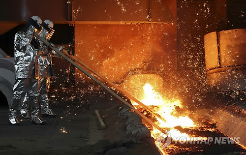 | △ 현대제철 제3고로 첫 출선 (서울=연합뉴스) 지난 13일 화입(火入)한 현대제철 당진제철소 제3고로에서 14일 오후 2시 첫 쇳물이 성공적으로 흘러나왔다. 방열복을 입은 작업자가 쇳물이 통로를 따라 토페토카(쇳물을 닮아 옮기는 차량)로 잘 흘러갈 수 있도록 유도하는 작업을 하고 있다. 2013.9.15 << 현대제철 제공 >> photo@yna.co.kr |
