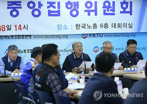 | △ 노사정대화 결렬 선언하는 김동만 위원장 (서울=연합뉴스) 김도훈 기자 = 한국노총 김동만 위원장이 8일 오후 서울 여의도 한국노총회관에서 중앙집행위원회를 마친 뒤 기자회견을 하고 있다. 이날 한국노총은 노동시장 구조개선을 위한 노사정 협상의 결렬을 선언했다. |